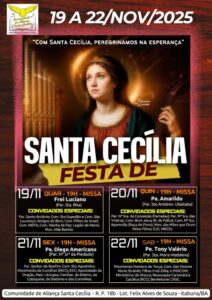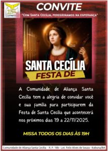 A Comunidade de Aliança Santa Cecília, localizada no bairro Félix Alves de Souza, em Itabuna, divulgou a programação oficial da Festa de Santa Cecília, que será realizada entre os dias 19 e 22 de novembro de 2025. O tema escolhido para este ano é “Com Santa Cecília, peregrinamos na esperança”, convidando os fiéis a vivenciarem um período de oração, devoção e partilha em comunidade.