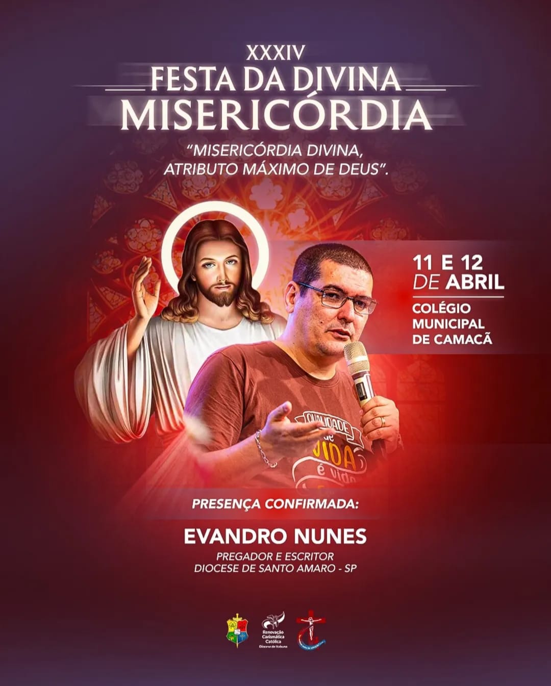 A Paróquia São Sebastião, no município de Camacan, pertencente à Diocese de Itabuna, no sul da Bahia, realiza nos dias 11 e 12 de abril a XXXIV Festa da Divina Misericórdia. O evento religioso convida fiéis de toda a região para um momento de oração, reflexão e aprofundamento espiritual, inspirado no tema Misericórdia Divina, atributo máximo de Deus.