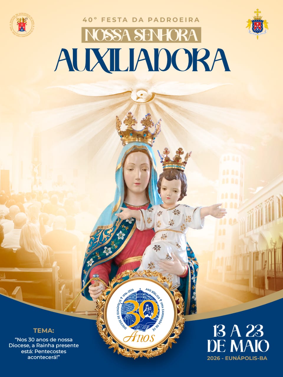 A Diocese de Eunápolis, no extremo sul da Bahia, divulgou a programação oficial da 40ª Festa de Nossa Senhora Auxiliadora, que será realizada entre os dias 13 e 23 de maio de 2026. O evento religioso reúne fiéis em um período de intensa vivência espiritual, com celebrações litúrgicas, momentos de oração e atividades tradicionais em honra à padroeira.
