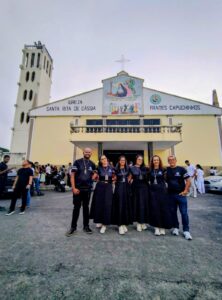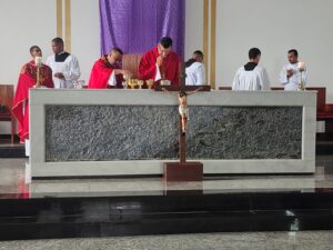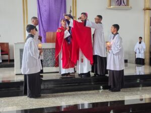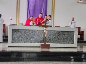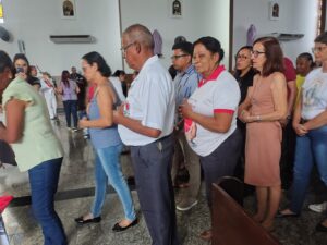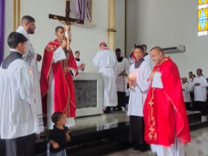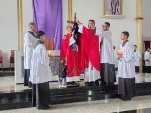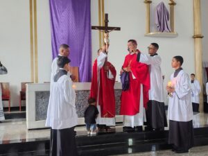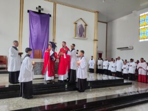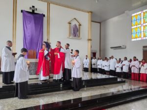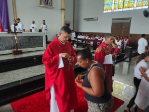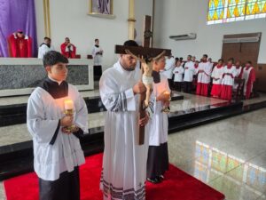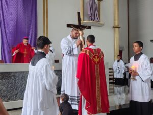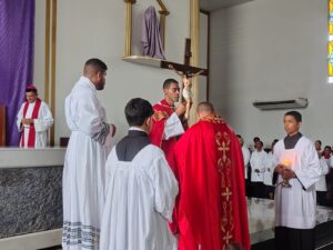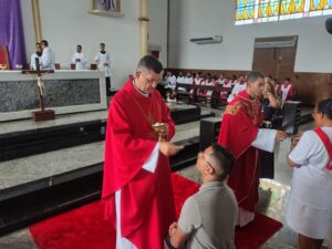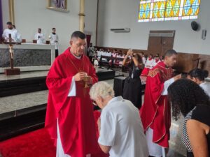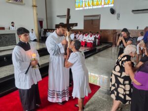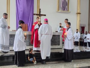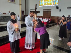 Um dos momentos mais marcantes foi a apresentação e adoração da Cruz. Frei Idário conduziu o crucifixo coberto com um pano vermelho até o altar, onde, por três vezes, foi elevado e descoberto gradualmente, enquanto se entoava o canto próprio do rito. O gesto recorda a entrega de Cristo ao Pai e à humanidade, sinal supremo de amor, conforme a Palavra: “quando eu for levantado da terra, atrairei todos a mim” (Jo 12,32).