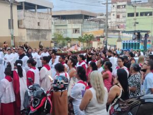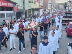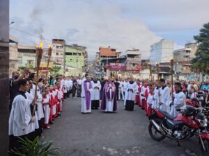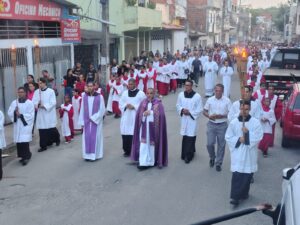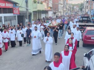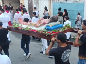 Após a celebração, centenas de fiéis participaram da tradicional Procissão do Senhor Morto, que percorreu ruas e avenidas do bairro São Caetano. A caminhada foi marcada por clima de recolhimento e oração, conduzindo os participantes à contemplação do mistério da morte de Jesus e à reflexão sobre o amor de Deus manifestado na cruz.