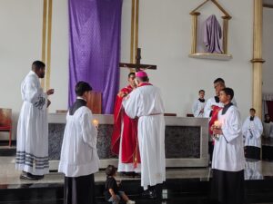 A celebração teve início com o tradicional rito da entrada em silêncio e a prostração do bispo diante do altar, gesto que expressa humildade e reverência diante do mistério da Paixão e Morte de Cristo. Em seguida, os fiéis acompanharam a Liturgia da Palavra, com a proclamação do relato da Paixão segundo a tradição da Igreja católica.