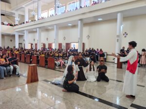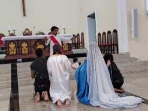 A programação começou às 13h30, com momentos de acolhida, música, apresentações teatrais, pregação e a celebração da Santa Missa, presidida pelo bispo diocesano Dom Jailton Oliveira Lino. Concelebraram os padres Gilvan Oliveira, pároco da Catedral de São José; Ítalo Souza de Santana, da Paróquia São Judas Tadeu; Roberto Silva Souza,(SAC, da Paróquia São Sebastião de Camacã; e Edvaldo Borges, vigário paroquial da Catedral. A missa foi celebrada às 16h e reuniu centenas de jovens, adultos e crianças de diversas paróquias que compõem as foranias Centro, Norte e Sul da Diocese, abrangendo 19 municípios e 35 paróquias.