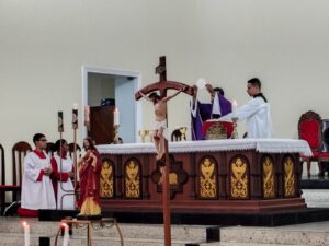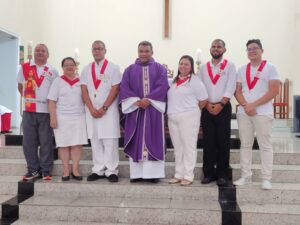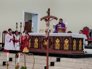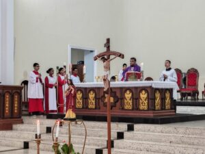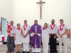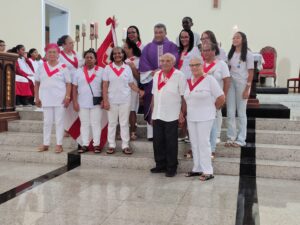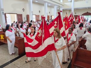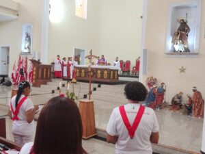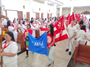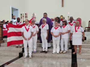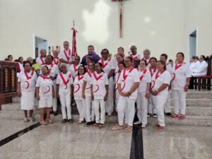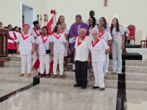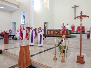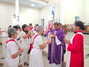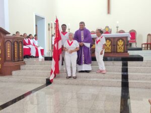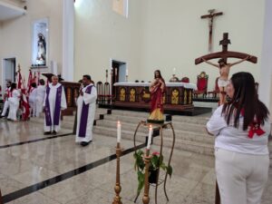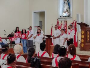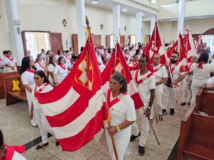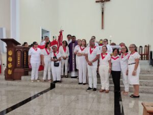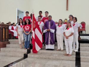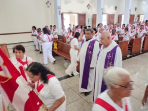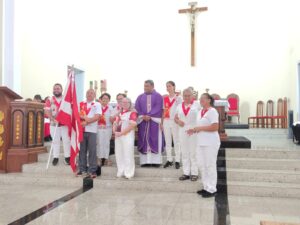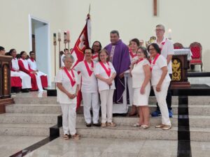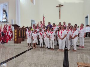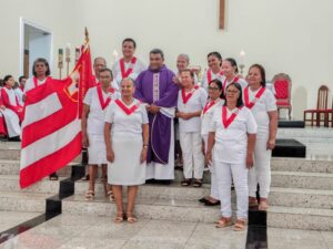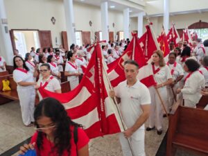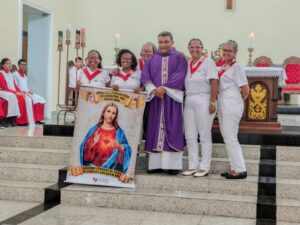 A entrada solene foi marcada pela condução da cruz e da imagem do Sagrado Coração de Jesus, símbolos centrais da espiritualidade do Apostolado da Oração, que tem como missão rezar com a Igreja e pela Igreja, em comunhão com as intenções do Papa e pelas necessidades do mundo.