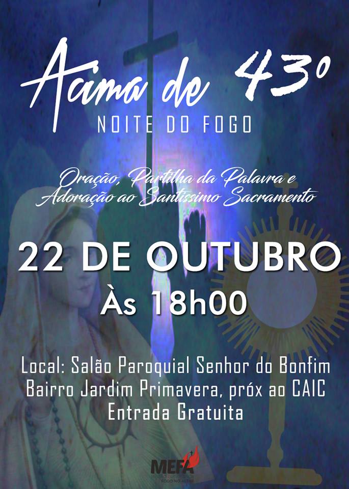Vai acontecer, no salão paroquial da paróquia Senhor do Bonfim, situada no bairro Jardim Primavera, em Itabuna,uma Noite Oracional conduzido pelo MEFA – Missão Eucarística Fogo no Altar, com partilha da palavra, oração, música e adoração ao Santíssimo Sacramento.