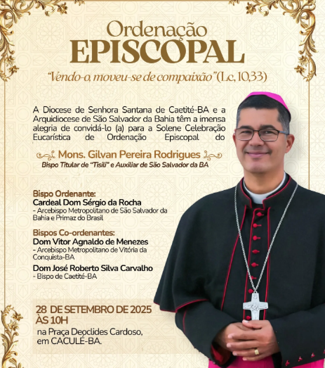 A Diocese de Senhora Santana de Caetité (BA) e a Arquidiocese de São Salvador da Bahia anunciaram a celebração da Ordenação Episcopal de Monsenhor Gilvan Pereira Rodrigues, nomeado bispo titular de Tsili e auxiliar de São Salvador da Bahia.