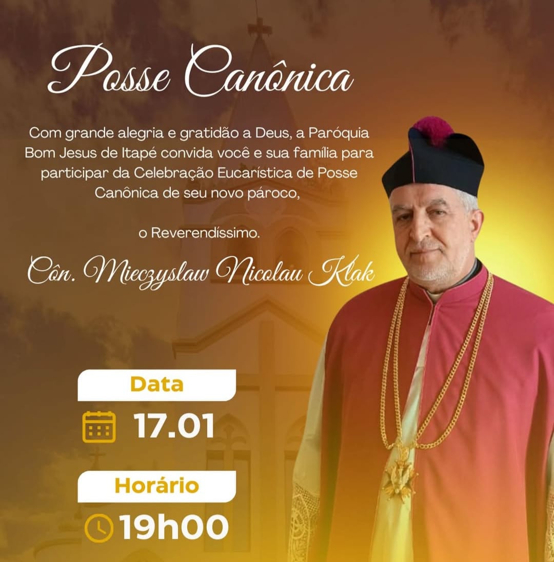 Paróquia Bom Jesus de Itapé, no sul da Bahia, realiza no sábado, 17 de janeiro, às 19h, na Igreja Matriz Bom Jesus, a Celebração Eucarística de Posse Canônica de seu novo pároco, o cônego Mieczyslaw Nicolau Klak. A celebração marca oficialmente o início do ministério pastoral do sacerdote à frente da comunidade paroquial.
