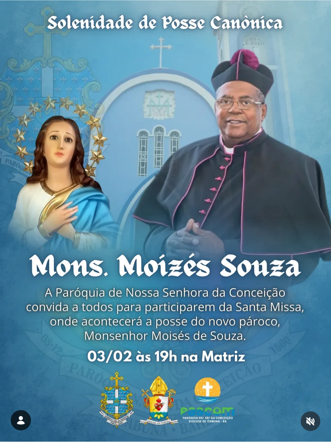A Paróquia Nossa Senhora da Conceição realizará, no próximo dia 3 de fevereiro, a Solenidade de Posse Canônica de seu novo pároco, Monsenhor Moisés de Souza. A celebração está marcada para as 19h e acontecerá na Igreja Matriz, reunindo fiéis, clero e representantes das pastorais e movimentos da comunidade paroquial.