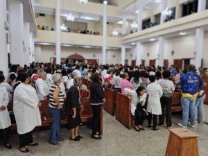 Após cerca de duas horas de peregrinação, os participantes foram acolhidos na Catedral, onde receberam a indulgência jubilar ao adentrarem o templo. Às 17h, houve um momento de oração comunitária e, às 18h, a Santa Missa foi presidida pelo padre Manoel Carlos, pároco da Paróquia Senhor do Bonfim. Concelebraram os padres Edvaldo Borges, vigário paroquial da Catedral, Gilvan Oliveira, pároco da Catedral, frei Luciano Martins, frei Pedro Cassimiro, Andrade Paz, Diego Americano, Ricardo e Idelfonso. A celebração reuniu centenas de fiéis, lotando completamente a Catedral de São José.