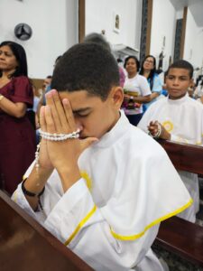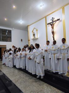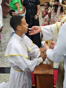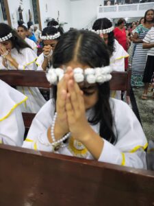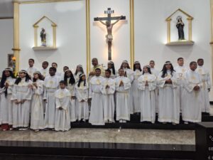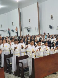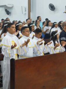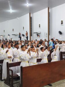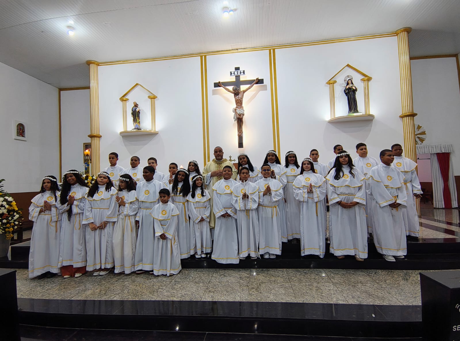 A Pastoral da Catequese da Paróquia Santa Rita de Cássia, na Diocese de Itabuna, no sul da Bahia, preparou 26 crianças, adolescentes e pré-adolescentes para a Primeira Eucaristia, celebrada no último sábado, 18 de abril. A celebração marcou o momento em que os catequizandos receberam, pela primeira vez, o Corpo e o Sangue de Jesus Cristo, sacramento instituído por Cristo na Última Ceia.