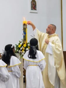 Durante a homilia, o sacerdote destacou a importância da presença das crianças na vida da Igreja. “Irmãos e irmãs, aqueles e aquelas que farão sua Primeira Eucaristia no dia de hoje. Seus pais, familiares, a nossa Igreja se encontra em festa, se encontra radiante. Podemos presenciar este momento na vida dessas crianças, pré-adolescentes e adolescentes, que farão esse encontro com o Senhor na Eucaristia”, afirmou.