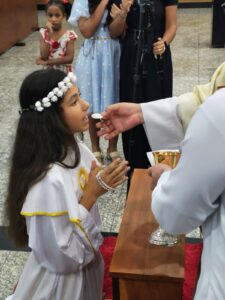 A celebração da Primeira Eucaristia representa um marco na caminhada cristã. É o momento em que, pela primeira vez, o fiel recebe Jesus Cristo na hóstia consagrada, aprofundando sua união com Deus. Mais do que um rito, trata-se de um encontro pessoal com Cristo, que se faz presente de maneira simples e real na Eucaristia.