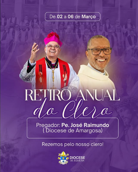 A Diocese de Jequié realizará, de 2 a 6 de março, o Retiro Anual do Clero, reunindo os sacerdotes para um período de oração, silêncio e renovação espiritual. O encontro integra a programação anual da Igreja Particular e tem como objetivo fortalecer a vida interior e o ministério pastoral dos presbíteros.