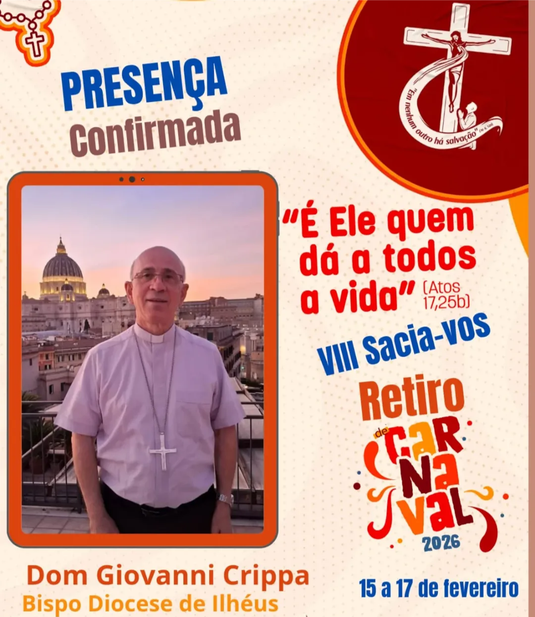 A Renovação Carismática Católica da Diocese de Ilhéus segue mobilizando fiéis para o Retiro de Carnaval VIII Sacia-vos 2026, que será realizado entre os dias 15 e 17 de fevereiro, no Centro de Treinamentos de Líderes, localizado no km 1 da Rodovia Ilhéus Itabuna, em Ilhéus, sul da Bahia. O encontro propõe uma vivência espiritual intensa durante o período carnavalesco, marcada pela oração, formação e comunhão.