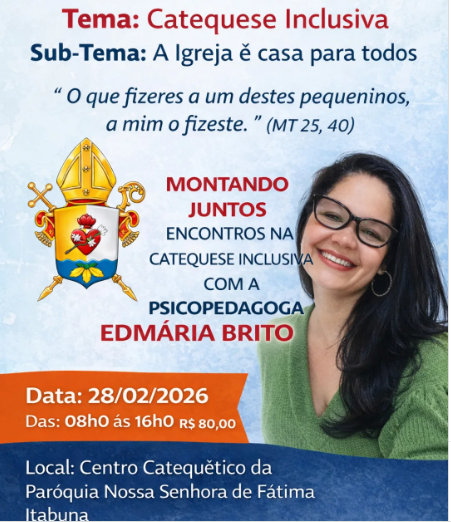 A Diocese de Itabuna realizará no dia 28 de fevereiro de 2025 o V Congresso Diocesano de Catequese, com o tema Catequese Inclusiva e o subtema A Igreja é casa para todos. O encontro acontecerá das 8h às 16h, no Centro Catequético da Paróquia Nossa Senhora de Fátima, em Itabuna, no sul da Bahia.